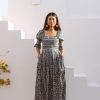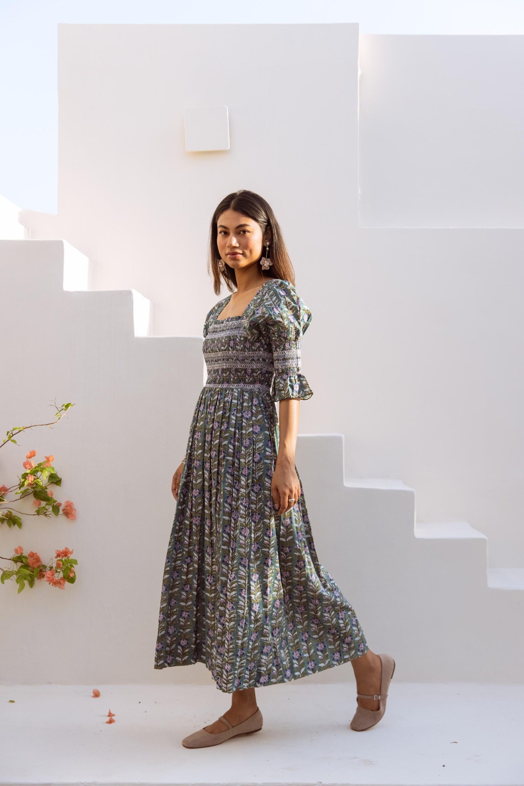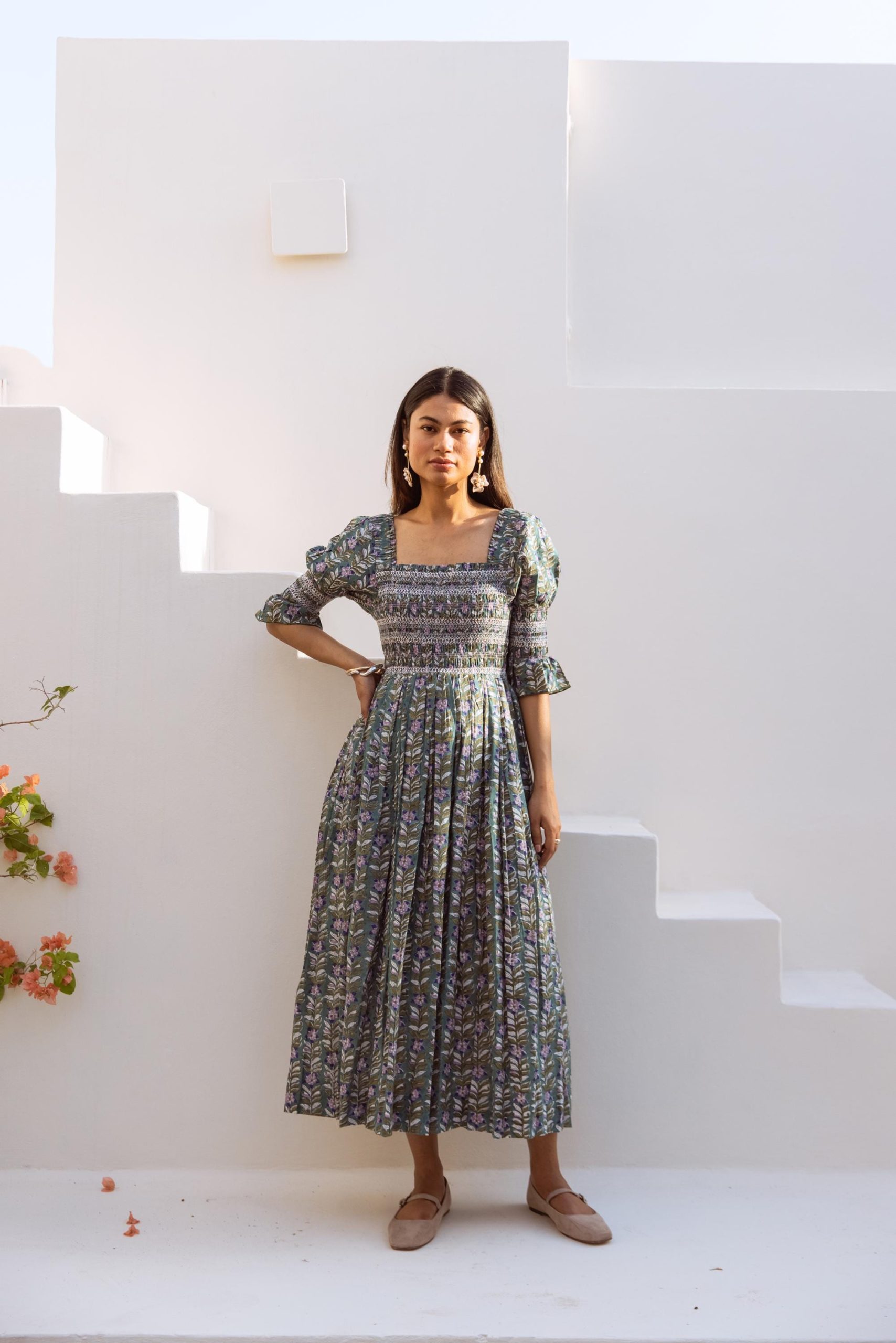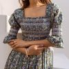 Crafted from breathable cotton and hand block-printed in vibrant, feel-good colors, this one’s made to brighten your day. The body features colorful smocking that hugs just right, while puff sleeves with matching smocked details add a fun, flirty touch. A square neckline keeps it sweet and structured, and yes—it has pockets.